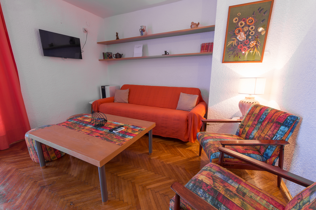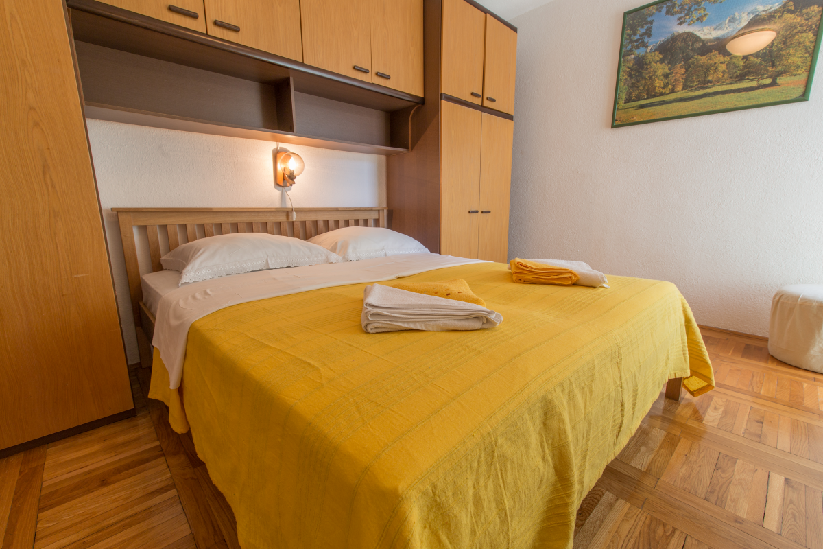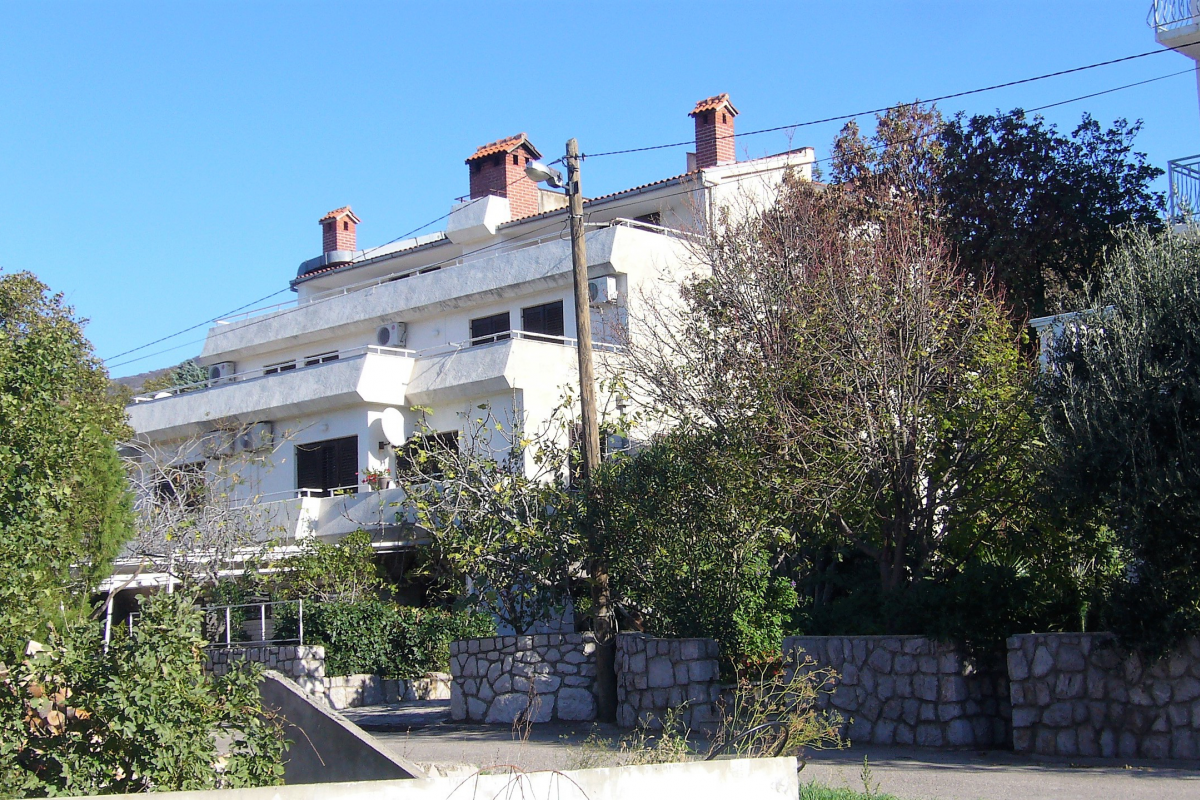 Wohnung B befindet sich auf der zweiten Etage. Es ist eine Wohnung für 6+1 mit einem Schlafzimmer mit Balkon und Bad, zwei Schlafzimmer, Bad, Küche, Wohnzimmer mit Klimaanlage, Sat-TV, große Terrasse mit Blick aufs Meer