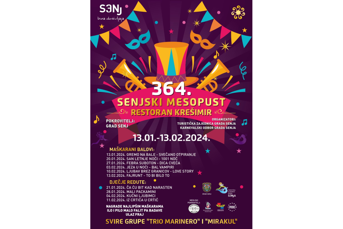 Sicherlich eines der attraktivsten Sommerereignisse an der Adria.Sechs Tage und Nächte „herrscht“ der Karneval im wahrsten Sinne des Wortes in der Stadt, um so maximal jedes einzelne Attribut aus seinem Namen zu rechtfertigen!! Schon seit dem weit zurückliegenden Jahr 1967 Anfang August haben die Einwohner von Senj mit ihren Gästen diese Stadt zum Zentrum des Sommerkarnevals an der Ostküste der Adria erhoben.